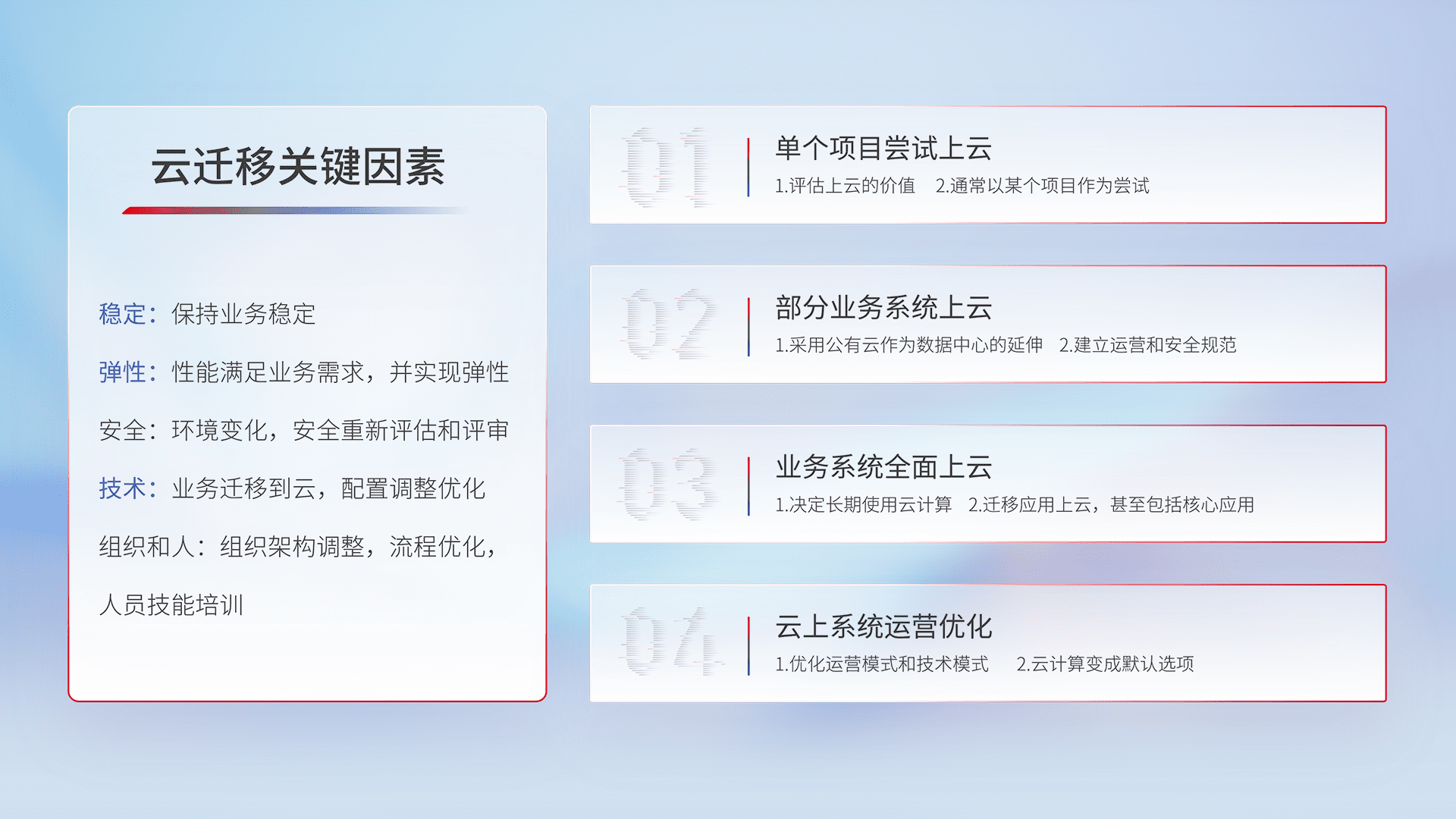 结合实际业务,,,,从规划设计、、、、云平台选型、、、、云原生改造、、、、数据迁移、、、集成交付,,,迁移全过程为客户识别最佳上云路径,,做好风险识别管理,,,设计网络架构、、身份权限、、、安全审计合规、、、操作审计、、、、日志审计、、、、监控告警策略、、多站点容灾设计等,,,对云上基础设施进行整体规划,,提升IT治理水平,,,以满足弹性、、高可用、、、高性能的需求。。。