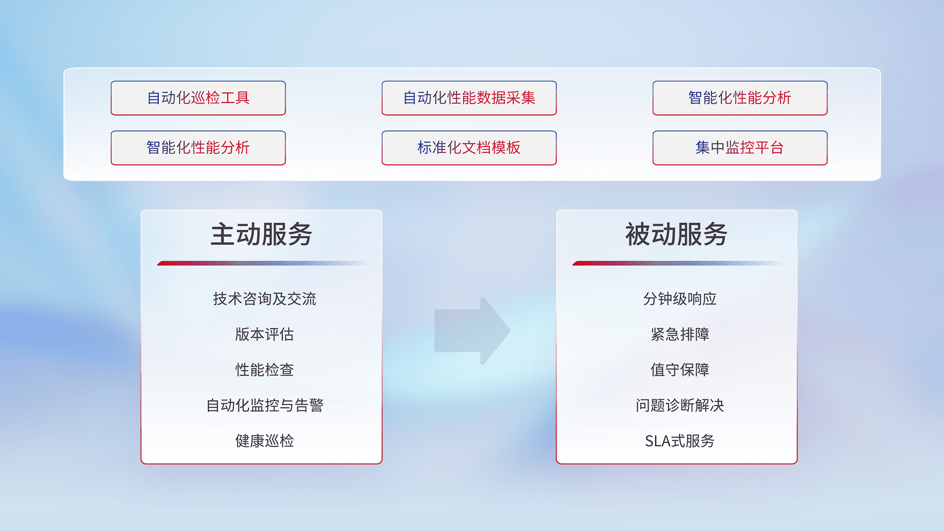 智能化工具和标准化文档,,保障服务质量,,,,提供主动服务(包含技术咨询、、版本评估、、、、性能检查、、自动化监控与告警、、、健康巡检)和被动服务包含(分钟级响应、、、、紧急排障、、、、值守保障、、、、问题诊断解决、、、SLA服务)。。。。