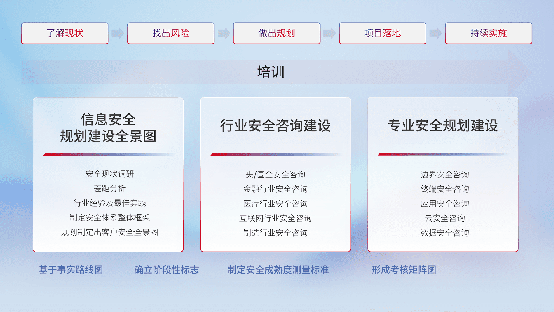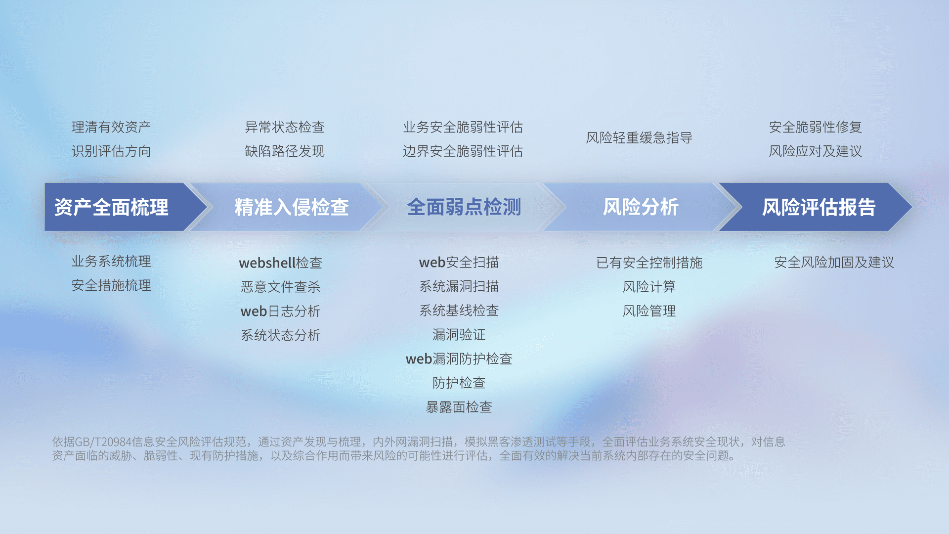 针对客户行业特性,,,以专业的安全服务+多厂商联合解决方案提供专属的一站式安全管理服务,,,,帮助客户全面感知网络空间威胁,,基于识别、、、、检测、、分析、、防护、、、监测、、、响应的服务理论模型,,,,从方案咨询、、、、集成交付、、、评估验证、、优化加固、、、运维运营,,致力于为客户提供完整的闭环管理式安全服务。。以实战经验为客户打造高抵御风险的安全体系,,帮助客户发现威胁、、、、对抗威胁、、、处置威胁,,不断积累安全对抗能力,,,,持续保障数字化安全。。