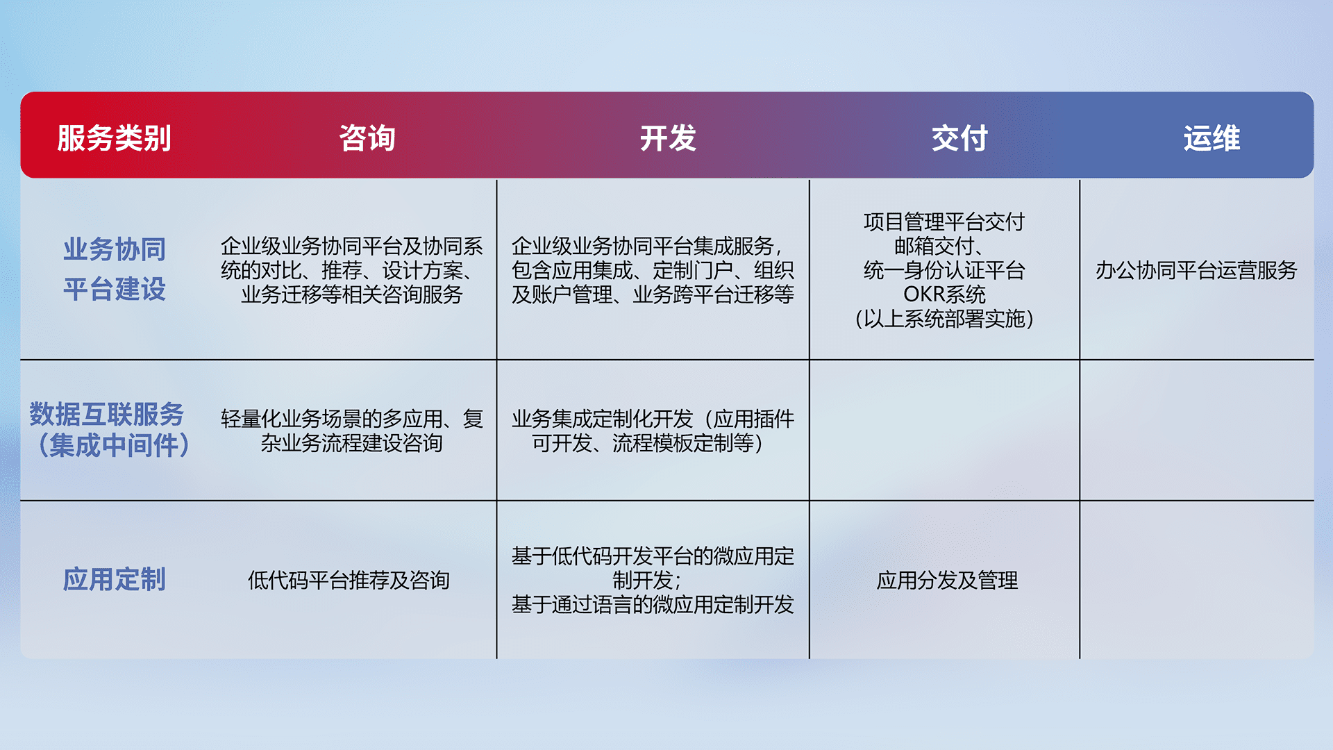针对钉钉、、企微、、、、IDaas等平台级产品提供产品的规划、、、方案、、交付、、定制化开发等服务,,实现如统一协同办公、、、智能客户服务、、、、混合会议管理、、、智能数据查询、、等业务场景,,实现数字化转型。。